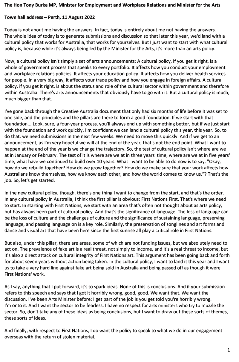 National Cultural Policy Perth town hall presentation transcript
