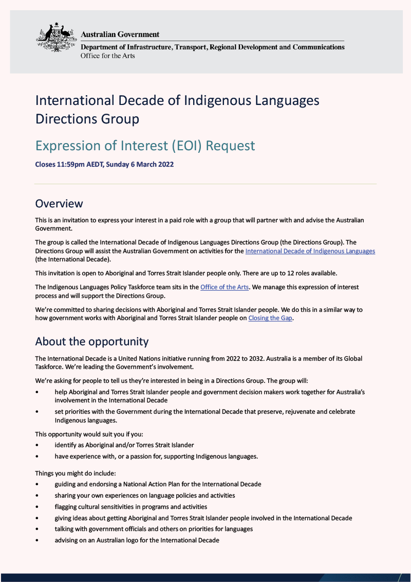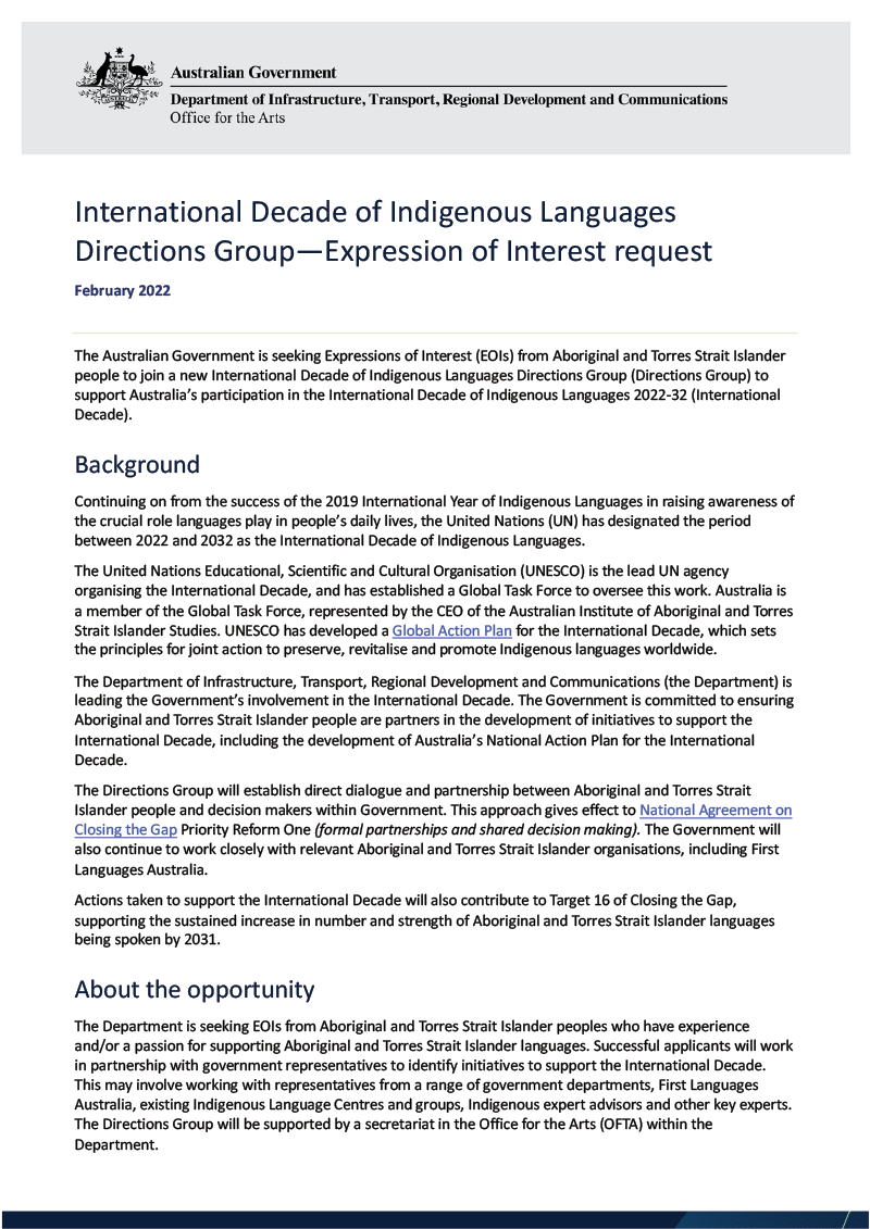 International Decade of Indigenous Languages Directions Group—Expression of Interest Request