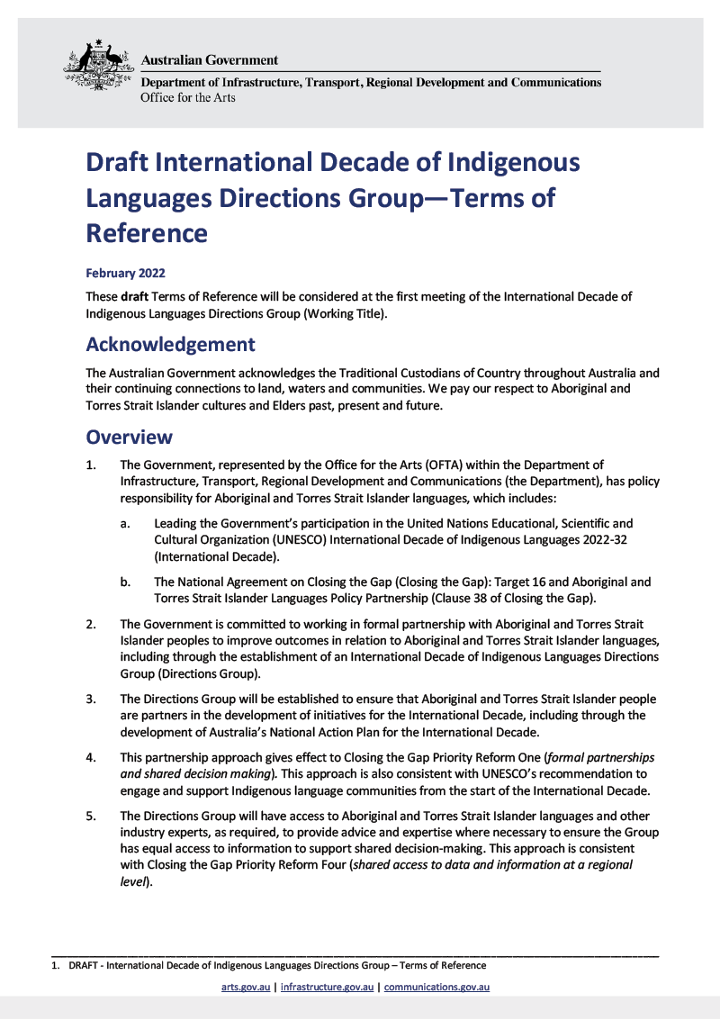 Draft International Decade of Indigenous Languages Directions Group—Terms of Reference